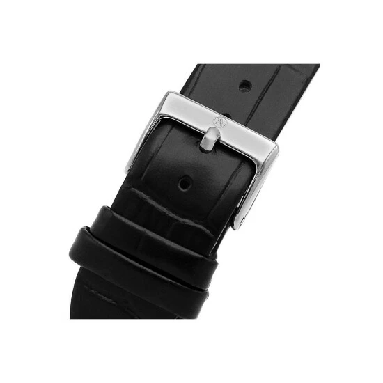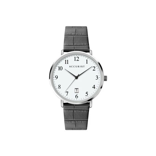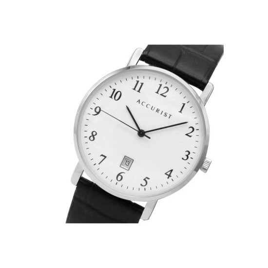 Battery Type : silver oxide | Primary Material : Stainless Steel | Case depth approx : 9.00mm | Case width approx : 38.00mm | Case shape : Circle | Strap type : Leather strap | Strap colour : Black | Clasp type : Strap buckle | Dial colour : White | Glass : Mineral | Movement : Quartz | Water Resistance : 30 metres | Includes date function | Guarantee : 2 years