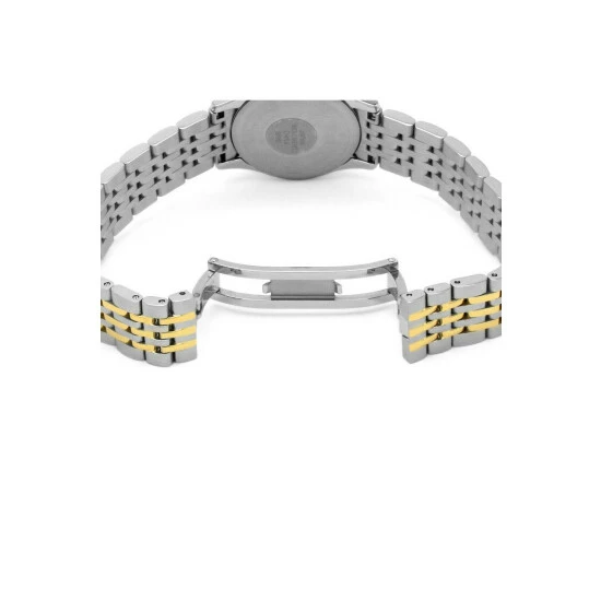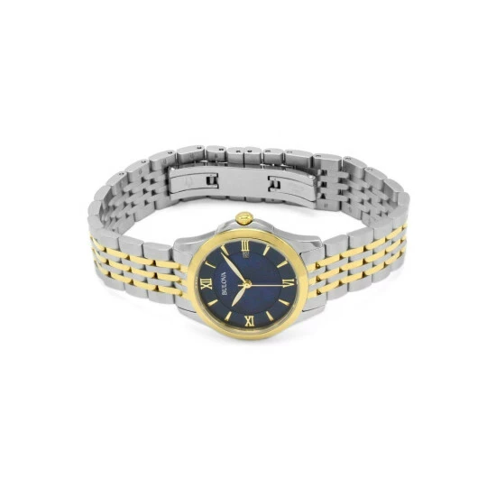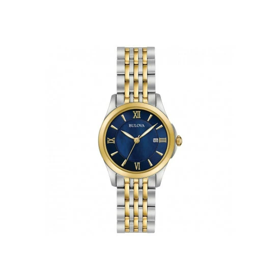 Primary Material : Gold Plated Stainless Steel | Case depth approx : 6.00mm | Case width approx : 27.00mm | Case shape : Circle | Strap type : Metal bracelet | Strap colour : Two tone | Dial colour : Blue | Movement : Quartz | Water Resistance : 30 metres | Includes date function | Guarantee : 2 years