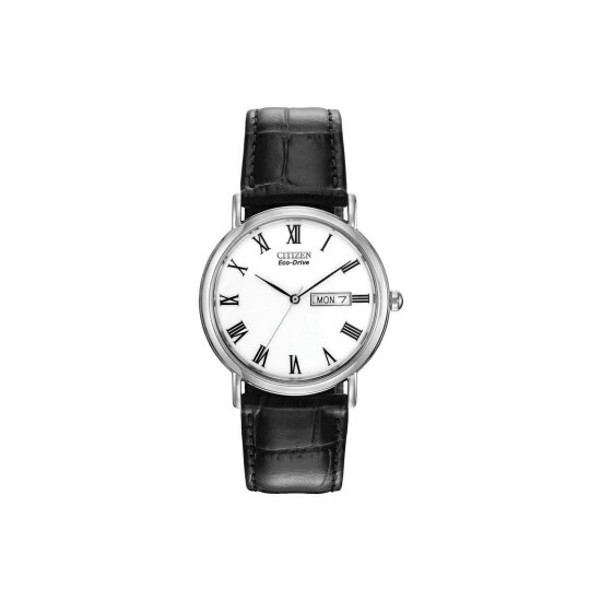 Primary Material : Stainless Steel | Case depth approx : 8.00mm | Case width approx : 36.00mm | Case shape : Circle | Strap type : Leather strap | Strap colour : Black | Clasp type : Strap buckle | Dial colour : White | Glass : Mineral | Movement : Eco-drive | Movement Source : Japan | Water Resistance : Water resistant | Includes date function | Guarantee : 5 years