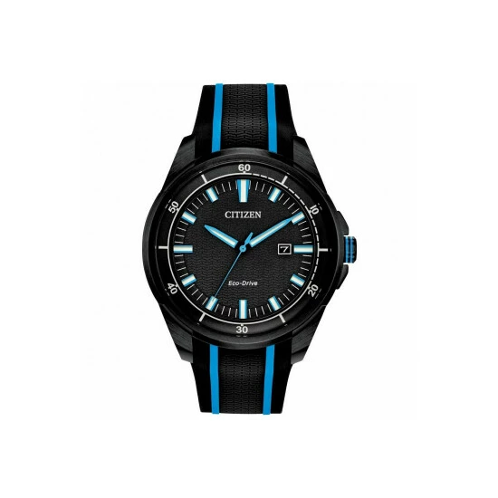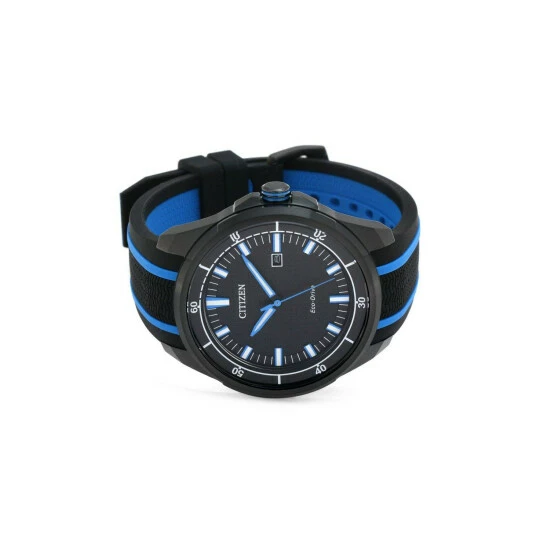 Primary Material : Stainless Steel | Case depth approx : 16.00mm | Case width approx : 46.00mm | Case shape : Circle | Strap type : Rubber Strap | Strap colour : Black | Dial colour : Black | Glass : Mineral | Movement : Eco-drive | Movement Source : Japan | Water Resistance : 100 metres | Includes date function | Guarantee : 5 years