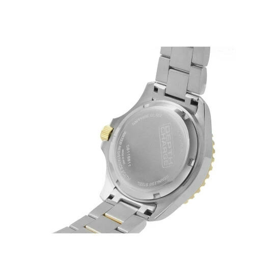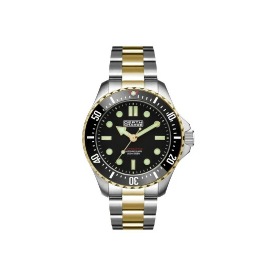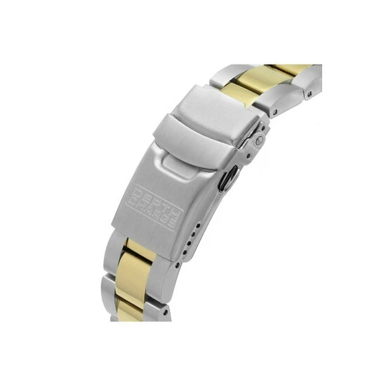 Built from robust stainless steel with two tone gold finishing to offset the crisp black dial, the 41mm case comes on a comfortable 3 link bracelet with an extendable deployment clasp providing extra convenience if worn with a wet suit.