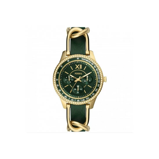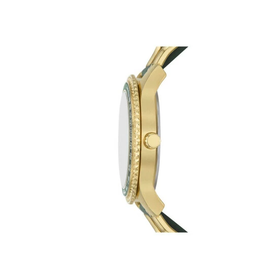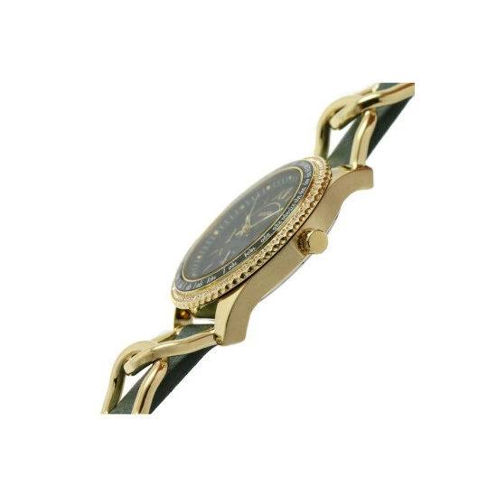 Primary Material : Gold Plated Stainless Steel | Case depth approx : 9.00mm | Case width approx : 38.00mm | Case shape : Circle | Strap type : Leather strap | Strap colour : Green | Clasp type : Strap buckle | Dial colour : Green | Glass : Mineral | Movement : Quartz | Movement Source : Japan | Water Resistance : 50 metres | Includes date function | Guarantee : 2 years