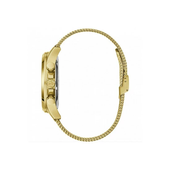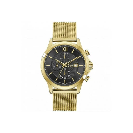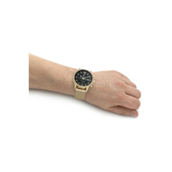 Primary Material : Stainless Steel | Case width approx : 44.00mm | Case shape : Circle | Strap type : Metal bracelet | Strap colour : Gold | Clasp type : Sliding buckle | Dial colour : Black | Glass : Sapphire | Movement : Quartz | Movement Source : Swiss | Water Resistance : 100 metres | Guarantee : 2 years