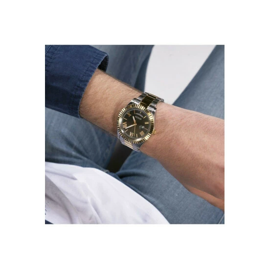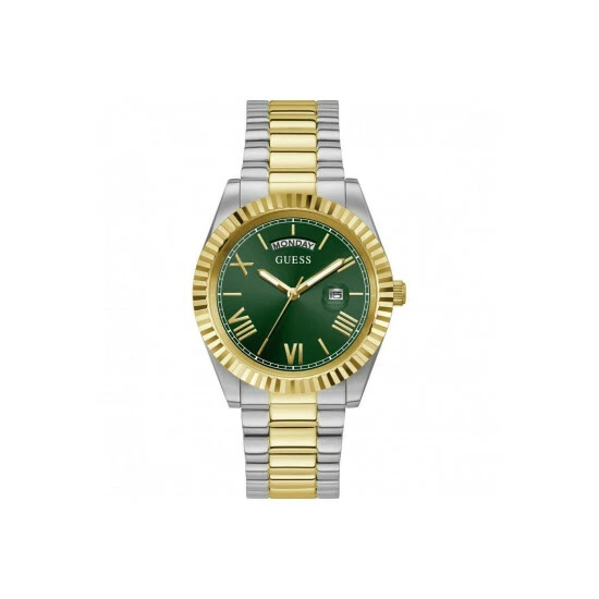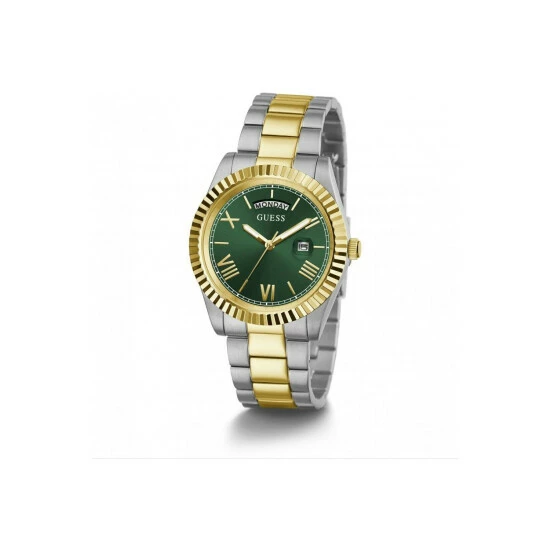 Primary Material : Stainless Steel | Case shape : Circle | Strap type : Metal bracelet | Strap colour : Two tone | Clasp type : Pilot Buckle | Dial colour : Green | Glass : Mineral | Movement : Quartz | Water Resistance : 50 metres | Guarantee : 2 Years