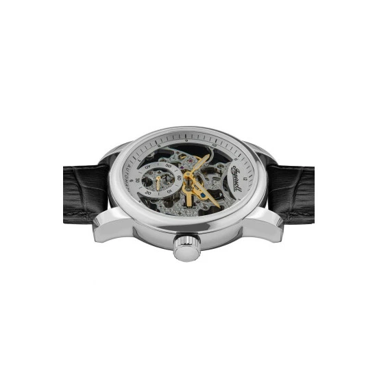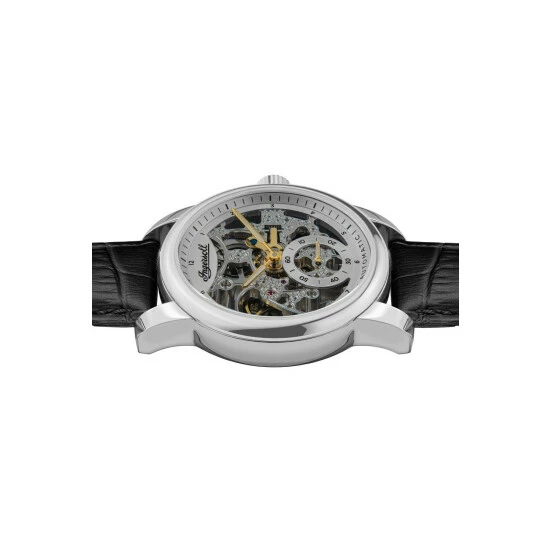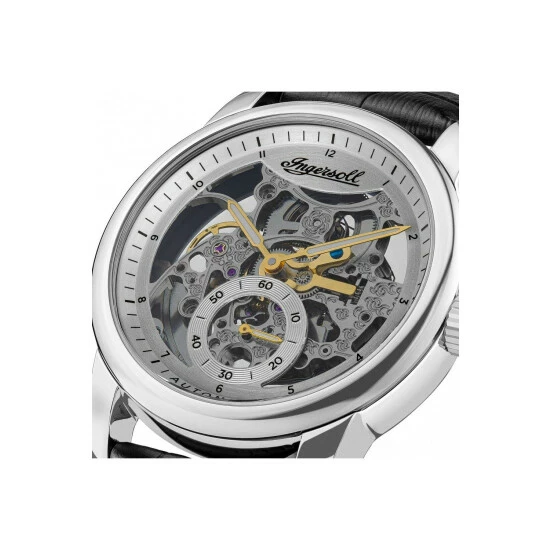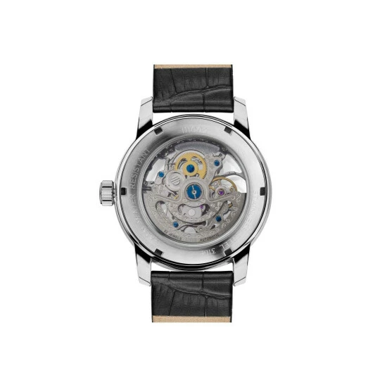 Primary Material : Stainless Steel | Case depth approx : 14.00mm | Case width approx : 43.00mm | Case shape : Circle | Strap type : Leather strap | Strap colour : Black | Clasp type : Strap buckle | Dial colour : Silver | Glass : Mineral | Movement : Automatic | Water Resistance : 50 metres | Guarantee : Lifetime