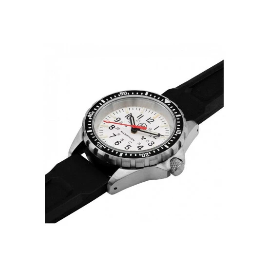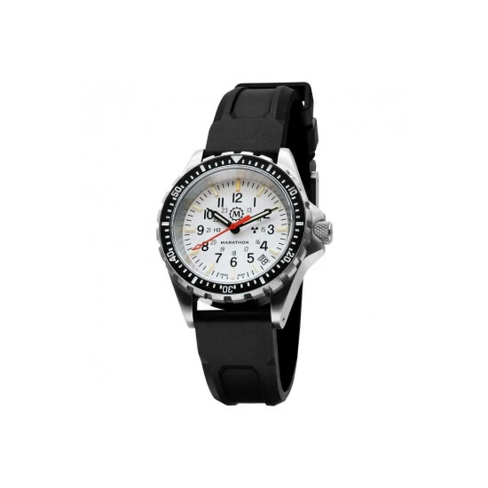 Battery Type : silver oxide | Primary Material : Stainless Steel | Case depth approx : 14.00mm | Case width approx : 36.00mm | Case shape : Circle | Strap type : Rubber Strap | Strap colour : Black | Clasp type : Special buckle | Dial colour : White | Glass : Sapphire | Movement : Quartz | Movement Source : Swiss | Water Resistance : 300 metres | Includes date function | Guarantee : 2 Years