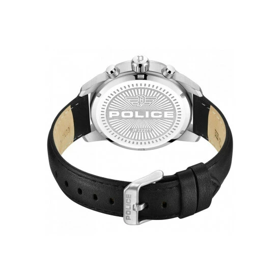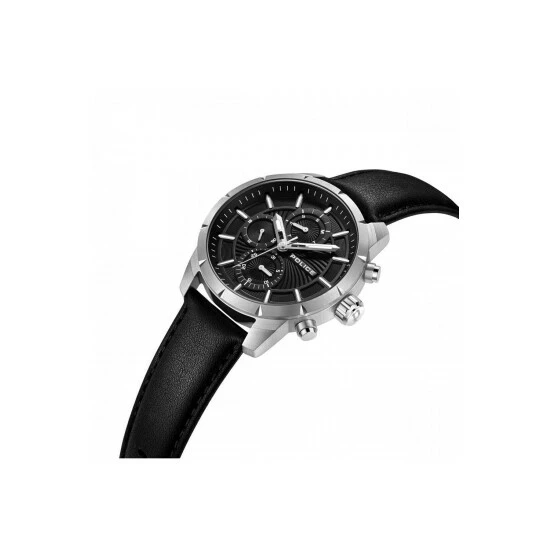 Battery Type : silver oxide | Primary Material : Stainless Steel | Case depth approx : 12.00mm | Case width approx : 45.00mm | Case shape : Circle | Strap type : Leather strap | Strap colour : Black | Clasp type : Strap buckle | Dial colour : Black | Glass : Mineral | Movement : Quartz Multifunction | Water Resistance : 50 metres | Guarantee : 2 Years