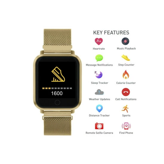 Smart Watch Type : Smart Touch | Heart Rate Monitoring | Step Counter | Sleep Tracker | Screen Type : Smart Screen | Processor / CPU : PAR2860QN | RAM : 32KB RAM 512KB ROM | Storage : 32k/512K | Primary Material : Aluminium | Case depth approx : 10.00mm | Case width approx : 36.00mm | Case shape : Square | Strap type : Rubber Strap | Strap colour : Gold | Dial colour : Black | Glass : Mineral | Movement : Digital Quartz | Water Resistance : None | Guarantee : 1 year