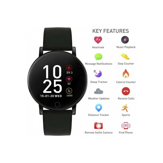 Smart Watch Type : Fitness | Heart Rate Monitoring | Step Counter | Sleep Tracker | Screen Type : Digital | Battery Capacity : 155mAH | Battery Type : lithium ion | Primary Material : Stainless Steel | Case depth approx : 10.00mm | Case width approx : 42.00mm | Case shape : Circle | Strap type : Rubber Strap | Strap colour : Black | Dial colour : Black | Glass : Mineral | Water Resistance : None | Guarantee : 2 years