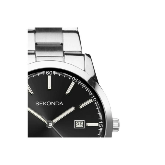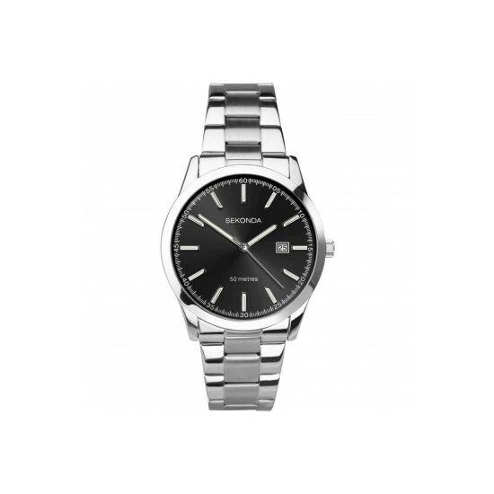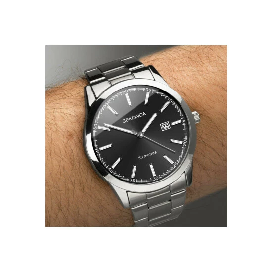 Primary Material : Base metal | Case depth approx : 12.00mm | Case width approx : 43.00mm | Strap type : Metal bracelet | Strap colour : Silver | Clasp type : Fold-over Deployment | Dial colour : Black | Glass : Mineral | Movement : Quartz | Water Resistance : 50 metres | Guarantee : 2 years