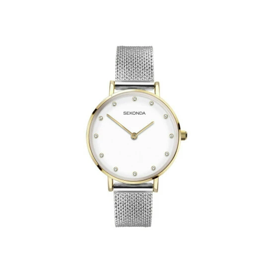 Primary Material : Gold Plated Stainless Steel | Case width approx : 32.00mm | Case shape : Circle | Strap type : Mesh Bracelet | Strap colour : Silver | Clasp type : Sliding buckle | Dial colour : White | Glass : Mineral | Movement : Quartz | Movement Source : Japan | Water Resistance : 10 metres | Guarantee : 2 years