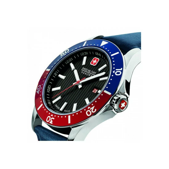 Battery Type : silver oxide | Primary Material : Stainless Steel | Case depth approx : 12.00mm | Case width approx : 42.00mm | Case shape : Circle | Strap type : Leather strap | Strap colour : Blue | Clasp type : Strap buckle | Dial colour : Black | Glass : Sapphire | Movement : Quartz | Movement Source : Swiss | Water Resistance : 100 metres | Guarantee : 3 Years