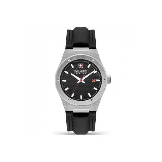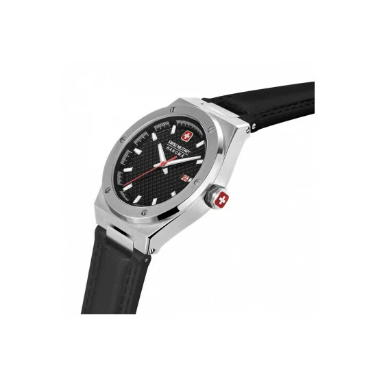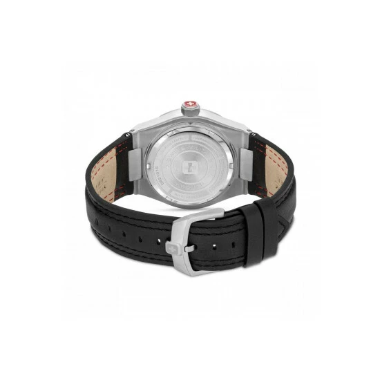 Primary Material : Stainless Steel | Case depth approx : 12.00mm | Case width approx : 43.00mm | Case shape : Circle | Strap type : Leather strap | Strap colour : Black | Clasp type : Strap buckle | Dial colour : Black | Glass : Sapphire | Movement : Quartz | Movement Source : Swiss | Water Resistance : 100 metres | Guarantee : 5 years
