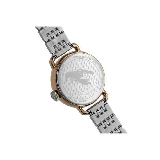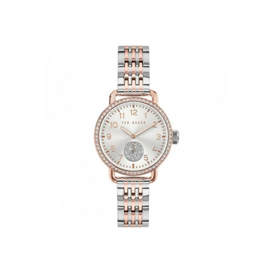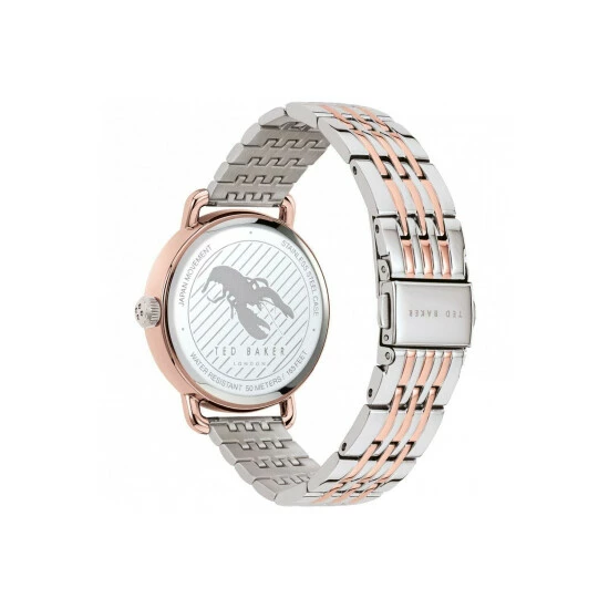Primary Material : Plated Stainless Steel | Case depth approx : 8.00mm | Case width approx : 34.00mm | Case shape : Circle | Strap type : Metal bracelet | Strap colour : Two-Tone Rose | Clasp type : Fold-over Deployment | Dial colour : Silver | Glass : Mineral | Movement : Quartz | Movement Source : Japan | Water Resistance : 50 metres | Guarantee : 2 years