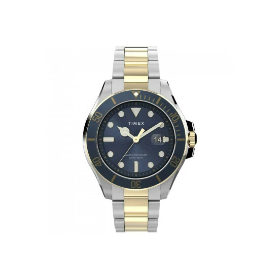 Primary Material : Base metal | Case depth approx : 11.00mm | Case width approx : 43.00mm | Case shape : Circle | Strap colour : Two tone | Dial colour : Blue | Glass : Mineral | Water Resistance : 100 metres | Guarantee : 2 years
