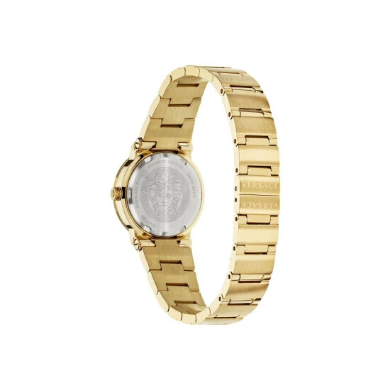 Primary Material : Stainless Steel | Case depth approx : 7.20mm | Case width approx : 27.00mm | Case shape : Circle | Strap type : Metal bracelet | Strap colour : Gold | Clasp type : Butterfly | Dial colour : Black | Glass : Sapphire | Movement : Quartz | Movement Source : Swiss | Water Resistance : 30 metres | Guarantee : 2 years